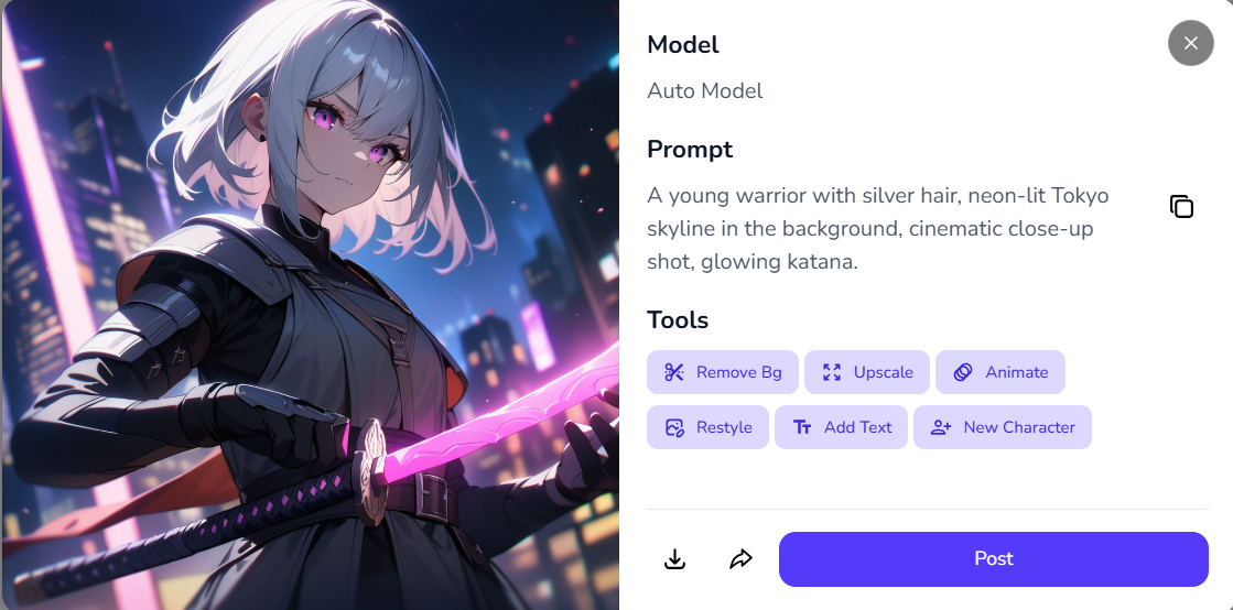 "A young warrior with silver hair, neon-lit Tokyo skyline in the background, cinematic close-up shot, glowing katana."