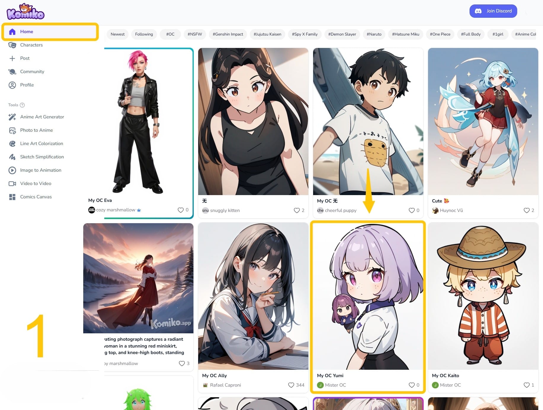 Visit the KomikoAI home page at KomikoAI Home. Scroll down through the user-generated content. You’ll find diverse, creative original characters posted by talented KomikoAI users from around the globe.